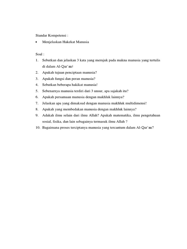 Check spelling or type a new query. Pertanyaan tentang hakikat penciptaan manusia. Maybe you would like to learn more about one of these? We did not find results for: